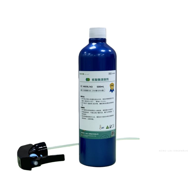 核酸酶清除劑(RNase and DNase Cleaner)是一種非酸堿性、無腐蝕性、綠色環保且對人體無害的核酸酶清除劑,具有與表面活性劑十分相似的理化性質。在RNase and DNase Cleaner有效組分的聯合作用下,儀器、設備和實驗臺表面核酸酶污染從吸附表面解離出來,進一步被非酶降解,被斷鏈清除,最終實現核酸酶的凈化。